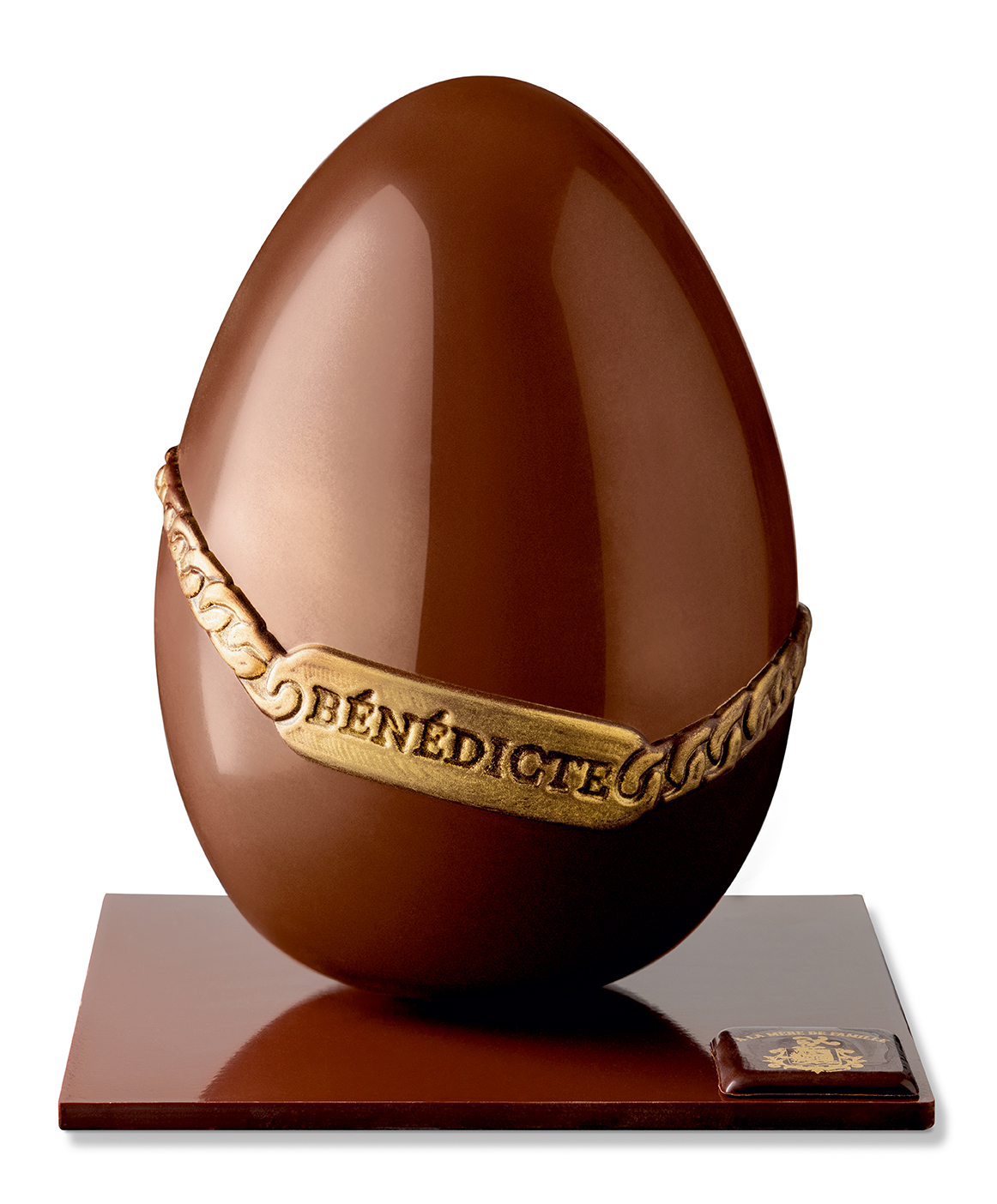 La plus ancienne chocolaterie de Paris (1761) appartenant à la famille Dolfi propose l’œuf « Bénédicte », composé de chocolat signature noir 65 % ou au lait 36 %, garni d’œufs pralinés papillotés et de fritures sèches. À découvrir également, une poule en chocolat dans un pot en chocolat rempli de pâte d’amandes et de garniture croquante.
