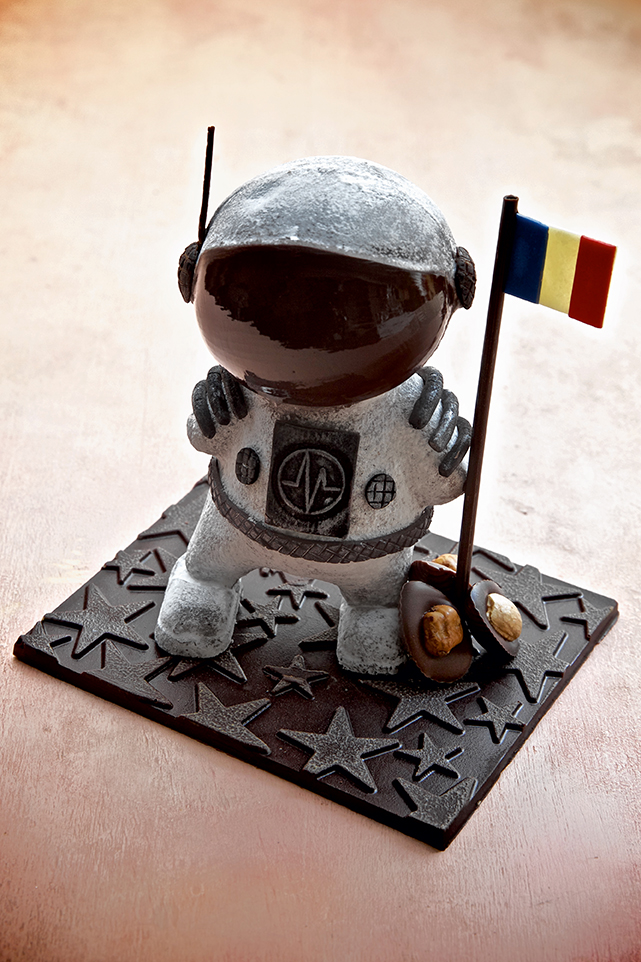 À Pâques, Christophe Michalak rend hommage aux 50 ans du premier pas de l’homme sur la Lune avec plusieurs créations. Buzz, un petit astronaute en chocolat noir et lait, garni de fritures ! Saturne, la 6e planète du système solaire en chocolat noir. Une jolie petite fusée composée d’un mélange de chocolat noir et de chocolat au lait, garnie de fritures. Un œuf gourmand en chocolat noir, au lait et au caramel garni de petits œufs à la noisette du Piémont ou pralinés.