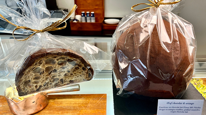 Certains prennent une liberté avec cette forme traditionnelle, tout en préservant le savoir-faire associé à la réalisation du produit. C'est le cas chez Brigat, une jeune boulangerie parisienne voisine de la Place des Vosges (3è arrondissement). Dans un écrin sobre et au travers de gammes courtes composées de références finement mises au point, Thomas et Lucio Colombo signent une approche moderne et très qualitative de la boulangerie parisienne. Leur création pascale ne fait pas exception, avec un trompe l'oeil particulièrement réussi : sous une coque de chocolat au lait, on découvre un Panettone au chocolat lait Pérou 50% Nicolas Berger, oranges confites et praliné amandes... une bien savoureuse surprise qui nous fera prendre de la Brioche pour Pâques, en plus des incontournables sujets et oeufs !
