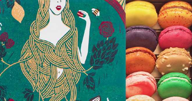 Artisan boulanger-pâtissier à Paris (quatre boutiques dans le 9e, 17e et 18e), Arnaud Delmontel propose à sa clientèle un coffret cadeau gourmand de macarons décoré par Maëva Tur, diplômée en philosophie de l’art et arts appliqués. Le coffret s’inspire de l’Art déco et du symbolisme qui évoque la nature et ses fruits, les fleurs et les parfums que le boulanger met à l’honneur dans ses macarons.