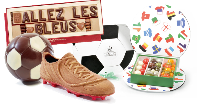 Le chocolatier Jadis et Gourmande (5 boutiques en région parisienne) soutient l’équipe de France de football avec son mythique alphabet praliné et Gianduja, un ballon et une chaussure de foot avec crampons au chocolat noir ou au lait.
