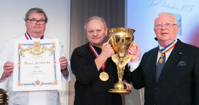 Dans les salons de Potel et Chabot à Paris, la 29e Coupe d’Or Internationale d’Art culinaire a été attribuée à Joël Robuchon en reconnaissance de son parcours professionnel exemplaire. Président de l’Académie Culinaire de France qui organise ce concours, Gérard Dupont a retracé la brillante carrière de Joël Robuchon : « Meilleur Ouvrier de France, c’est le chef le plus étoilé du monde avec 25 étoiles au guide Michelin, sans compter les prochaines… Toutes les personnes qui ont travaillé avec vous gardent un souvenir gravé dans leur mémoire. Juste, rigoureux, exigeant, pédagogue, toujours prêt à donner un conseil. Parmi eux, de nombreux sont devenus MOF, chefs de cuisine ou de pâtisserie, créant ainsi une école du savoir culinaire partagé ».