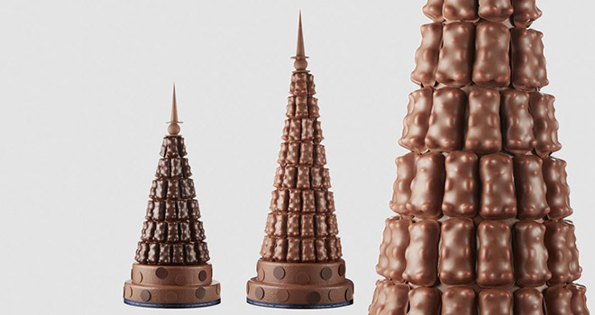 Le pâtissier-chocolatier Cyril Lignac (34, rue du Dragon Paris 6e et 25, rue Chanzy Paris 11e) mise sur une de ses dernières créations : l’ourson guimauve qui cultive avec gourmandise la nostalgie de l’enfance. Une fine couche de chocolat habille la guimauve fait-maison rehaussée d’une pointe de vanille. Version noir, lait ou or, les pyramides XXL se composent de 60 ou 85 oursons en chocolat.