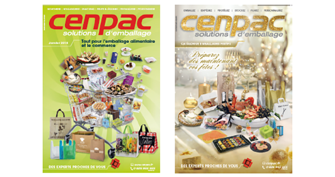 Pour bien choisir emballages et équipements, Cenpac vous conseille avec plus de 1 200 références d’emballage alimentaire. Site Internet, téléphone (60 assistants et assistantes commerciales à votre écoute), catalogue général et catalogues dédiés à un métier (ex : boulangerie et pâtisserie) ou à une tendance (emballage boutique, snacking, fêtes de fin d’année). Ces catalogues papier de 208 pages sont édités deux fois par an. Vous y trouverez tout l’univers de l’emballage industriel et alimentaire (caisses, cartons, palettes, films, hygiène, consommables…) au meilleur rapport qualité-prix ! Dans le catalogue général, plus de 4 000 produits sont disponibles en stock. La livraison en 24 h minimum et 48 h maximum est offerte dès 250 € HT d’achat. En dessous, les frais de participation à la livraison sont de 17,90 €.