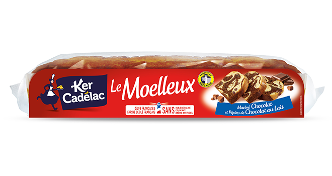 ... que Ker Cadélac se plaît à revisiter en élaborant une nouvelle recette à base de chocolat pâtissier et de pépites de chocolat au lait. Cette nouvelle référence rejoint une gamme de 4 gâteaux moelleux : Original, chocolat, chocolat-noisette ou Maxi Pépites de Chocolat, ils partagent comme point commun l'emploi de bons ingrédients français : des œufs, de la farine de blé et toujours sans huile de palme. Ce Moelleux Marbré Chocolat et Pépites de Chocolat au Lait offre ainsi un gâteau à la texture moelleuse et aérée, doté de la gourmandise du chocolat et du croquant des pépites de chocolat au lait... à découvrir sans plus attendre !