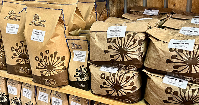 C'est ce système qui s'est imposé à Orvilliers, avec la mise en oeuvre des principes d'agro-écologie : en plus de la certification Agriculture Biologique, les deux frères ont souhaité donner à leurs 50 hectares de terre un caractère particulièrement durable et résilient. Ils cultivent du blé, du seigle, de l'engrain, du grand épeautre, du sarrasin, du quinoa... tout en sélectionnant les graines d'accomodant le mieux de leur terroir, qui sont ensuite moulues dans les deux moulins à meule de pierre installés sur l'exploitation.