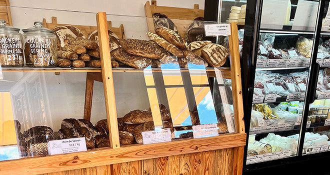 Le temps où les ventes de pain étaient réalisées deux jours par semaine à la ferme sont bien loin : à présent, c'est une boutique paysanne qui fait vivre le village de Broué du mardi au vendredi de 15h à 19h30, laquelle crée du lien et fait vivre une filière locale et vertueuse. Dans cet ancien bureau de Poste, ce ne sont pas que des pains au levain naturel qui garnissent les vitrines : on y trouve également des huiles et pâtes issues des grains de la ferme, ainsi que les productions d'autres paysans locaux. Légumes, viandes, produits laitiers, jus... le commerce couvre un grand nombre d'unités de besoin, avec en fil conducteur le respect de la terre et des ressources naturelles.