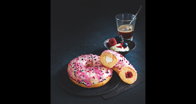 Pour vos clients en quête de nouvelles sensations, trois recettes gourmandes : donut façon crème brûlée (la pâte nature au double fourrage caramel et goût vanille est couronnée d’un glaçage goût vanille délicatement décoré de rayures au cacao et parsemé de morceaux de caramel croquants) ; donut façon chocolat cake (le donut décline une pâte cacaotée au double fourrage cacao et cacao-lait, glaçage au chocolat au lait, rayures au chocolat noir belge et morceaux de chocolat blanc en guise de décor) ; donut façon cheesecake framboise : la pâte nature au double fourrage framboise et goût fromage blanc est recouverte d’un glaçage au lait, rayures à la framboise agrémenté de perles de sucres colorées.