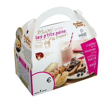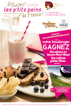 Du 1er novembre au 15 décembre, 400 boulangeries artisanales réparties sur tout le territoire français mettront à l’honneur le goûter traditionnel : pain et fromage ou pain et chocolat ! Quel meilleur endroit que la boulangerie de son quartier, au retour de l’école, pour y trouver tous les ingrédients d’une collation saine et équilibrée ? Une habitude qui a tendance à se perdre, au profit de produits « tous prêts », trop gras et trop sucrés ! C’est pour faire revivre cette tradition que Petits Moulins de France a choisi de s’associer aux Fromages de Savoie A.O.P. et I.G.P. et aux chocolats Weiss ! Durant 6 semaines, l’opération « Miam, les p’tits pains de France ! », les 7 Fromages AOP et IGP de Savoie s’afficheront aux côtés des chocolats Weiss, dans les 400 boulangeries artisanales participantes. Chaque boulanger proposera la « p’tite box goûter », qui contiendra, outre la collation sucrée ou salée, des idées originales pour un goûter en famille ou avec des copains, des recettes du MOF boulanger Sylvain Herviaux à base de chocolat ou de Fromages de Savoie et un bulletin de participation pour le jeu concours organisé dans chaque boulangerie.Le goûter est un repas essentiel pour chaque enfant et doit couvrir 15% de ses apports journaliers.