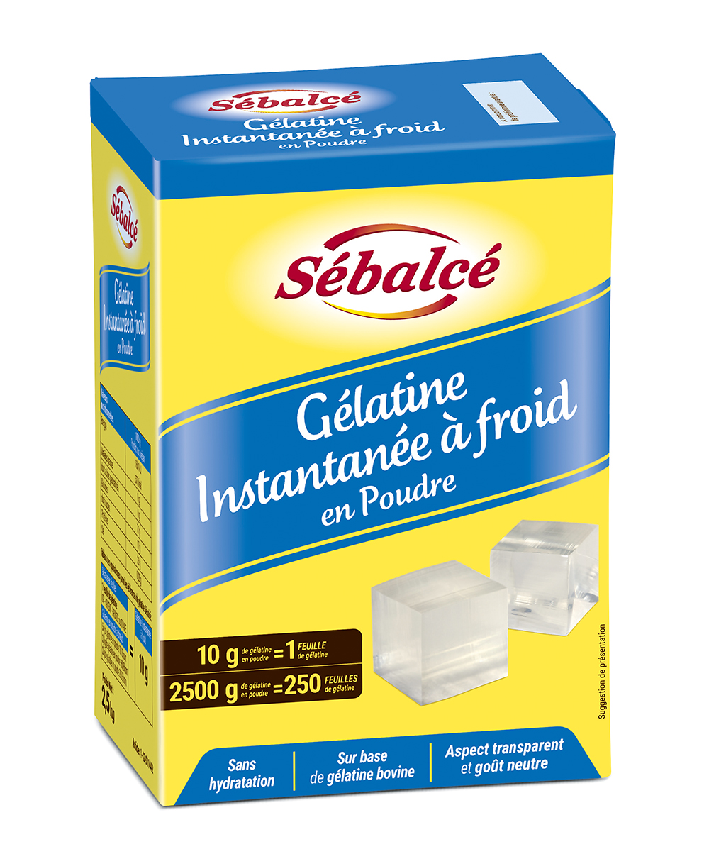 Plus besoin de chauffer, ni d’hydrater avec la nouvelle gélatine Sébalcé en poudre sur base bovine qui se verse directement dans l’ingrédient ou la masse à gélifier, sans hydratation préalable et à température ambiante. Après incorporation, procédez au montage de vos entremets ou versez directement dans les contenants de votre choix avant de surgeler ou de mettre au frais. 10 g de gélatine instantanée à froid correspondent