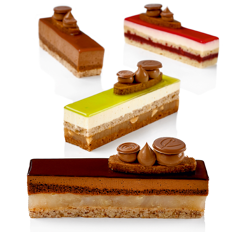 Pascal Caffet propose quatre bûches plus originales que jamais ! « Chocolat et poires de Noël » : sur un biscuit dacquois aux amandes, des morceaux de poires au sirop vanillé se superposent au biscuit et mousse au chocolat noir intense. « Rubis » : autour d’un biscuit amande aux zestes de citron, compotée et morceaux de griotte se mêlent à une mousse aux fruits de l’amandier. « Lumineuse » : biscuit moelleux noisettes, croustillant chocolat feuilleté praliné aux noisettes du Piémont maison, crémeux chocolat lait au citron vert, caramel vanille, noisettes torréfiées concassées, mousse au chocolat au lait 40 %, crème légère vanille citron. « Merveilleuse » : biscuit chocolat, mousse au chocolat noir 70 %, croustillant feuilleté et praliné noisette du Piémont maison.