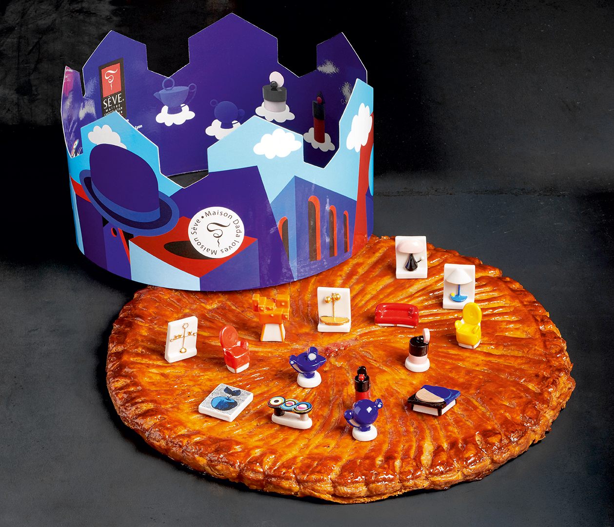 Pour l’Épiphanie, le pâtissier-chocolatier Richard Sève propose sa fameuse galette des rois à la praline rouge. Sous le feuilletage, auquel un glaçage au sirop de marrons glacés apporte du croustillant et des notes caramélisées et vanillées, se cache une frangipane à la praline rouge (composition : des pralines surfines concassées aux gousses de vanille de Madagascar, des amandes, du lait, du beurre d’Echiré, des œufs et un soupçon de farine). Les pralines maison viennent sucrer la frangipane et jouer le contraste des textures. Dans ces galettes, une série exclusive de 15 fèves représentant la gamme contemporaine de meubles, luminaires, tapis et accessoires de Thomas Dariel, créateur de la Maison Dada. Les couronnes des rois sont également aux couleurs du designer.