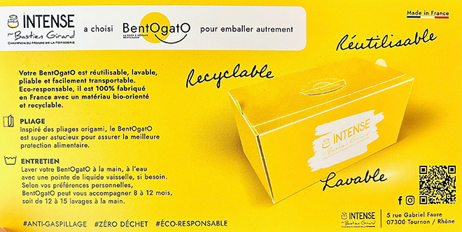 Côté pâtisserie, la BentOgatO est une solution élégante, lavable et personnalisable pour emballer les gâteaux. Elle se décline en 5 formats et en de multiples couleurs. Plusieurs pâtissiers ont déjà adopté l'objet à travers la France, à l'image de la pâtisserie Intense à Tournon-sur-Rhône. Autant d'idées qui ne devraient pas manquer d'élargir le cercle des convaincus de la circularité !