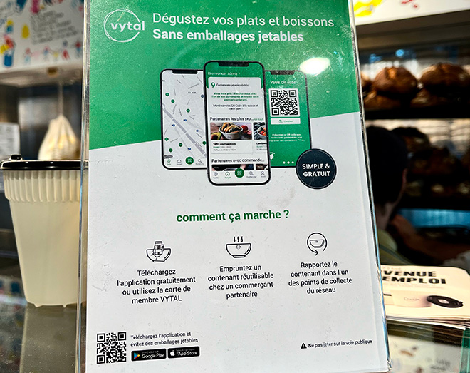 S'il n'y a pas d'obligation pour la vente à emporter, rien n'empêche de voir plus loin et d'adopter de bonnes pratiques qui contribueraient à créer une véritable boulangerie circulaire. Les clients peuvent bien entendu utiliser leurs propres contenants, mais les freins à l'adoption sont nombreux : manque de praticité (formats inadaptés, solidité...), oublis, impossibilité d'utilisation dans de nombreux restaurants... Pour y pallier, des start-ups développent des solutions innovantes : Vytal permet ainsi d'emprunter un contenant grâce à un système de QRCode apparairé au compte de l'utilisation créé dans l'application associée. Le client dispose alors de 14 jours pour rendre l'objet chez l'un des partenaires, qui se chargera de le nettoyer pour un prochain usage. La démarche est entièrement gratuite pour le client, il n'est débité que s'il ne rend pas le contenant dans le délai imparti. Le système est financé par les entreprises partenaires, qui paient une redevance pour chaque remplissage des contenants. Ils économisent ainsi les frais d'emballage jetable.