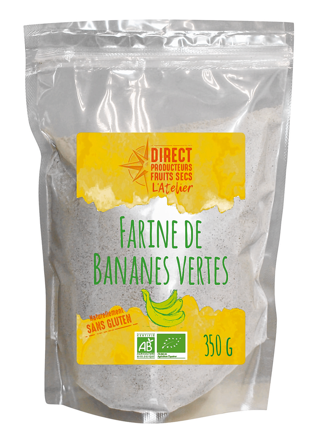 Farine sans gluten, la nouvelle farine de bananes vertes Direct Producteurs fruits secs, offre un vent d’exotisme. Fabriquée à partir de bananes récoltées en Équateur et certifiées AB, elle est digeste et riche en potassium. Utilisée crue, seule ou mélangée à d’autres farines, elle est très polyvalente. Sa texture légère facilite le gonflant en pâtisserie avec une quantité réduite d’environ 25 % par rapport aux préconisations des recettes. Grâce à son pouvoir liant et épaississant, elle apporte une légère note de banane dans les cookies, les tartes, les cakes, les flans...