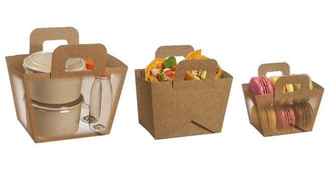 Ces paniers de transport en carton recyclable et biodégradable, avec un pliage sans colle, sont dotés de poignées et s'inspirent librement des traditionnels cabas. Ce visuel est un véritable appel aux déjeuners sur l'herbe à l'approche des beaux jours : les trois tailles (mini format 95 x 44 x 55 mm, moyen format 135 x 60 x 80 mm, grand format 275 x 140 x1 75 mm) permettent une adaptation à tout type de prestation, de l'encas à la formule repas.