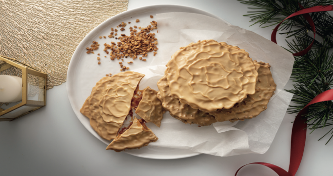 Un mouvement qui se prolonge lors des fêtes de fin d’année, avec notamment une nouvelle forme riche en textures, comme la Tuile Craquante créée par la Chocolate Academy Cacao Barry®. Elle associe le caractère régressif du chocolat blanc Zéphyr caramel au croquant du praliné grain, lesquels dévoilent, une fois rompus, toute l’onctuosité du fourrage caramel signé Callebaut !