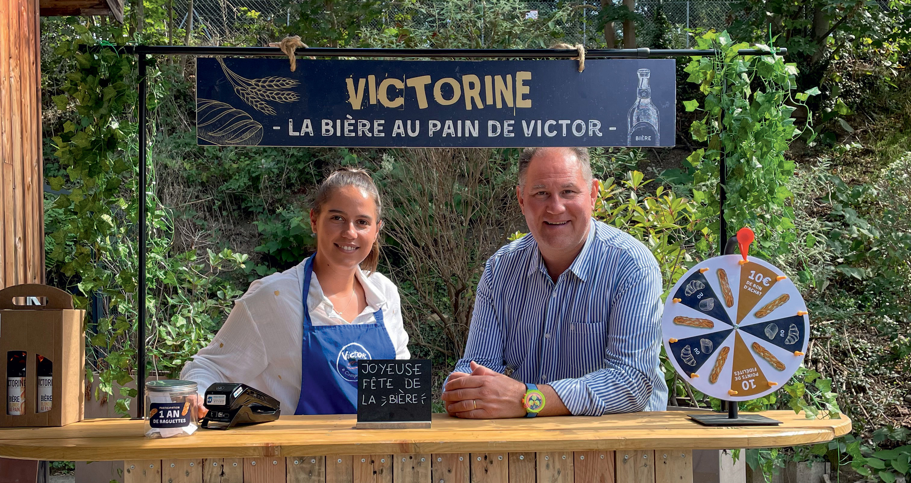 Victor & Cie a lancé sa propre bière artisanale, la Victorine, « conçue à partir de nos invendus de pains de tradition et semi-complets (T80), que nous tranchons, torréfions légèrement, puis broyons. Le brasseur Terre de Bières, basé à Villefranche-sur-Saône (à 20 mn de chez nous), incorpore cette chapelure dans son processus de brassage (en y retirant 30 % de ses céréales habituelles) ». 180 kg de pain sont réemployés pour un brassin. Les 5 500 bouteilles (33 cl) qui en résultent, vendues uniquement chez Victor & Cie pour le moment (3,90 €/pièce), ont d’ores et déjà trouvé leurs adeptes : « Un public surtout féminin, séduit par cette blonde à la robe ambrée, très peu amère, locale et antigaspi. » Jalon supplémentaire de ce cercle vertueux : « Une start-up voisine, Maltivor, transforme la drêche, la pulpe résiduelle du brassage, en farine avec laquelle nous faisons notre pain signature à la drêche, qui se distingue par sa très forte valeur nutritionnelle (deux fois plus de fibres que dans un pain standard), sa mie moelleuse et sa croûte croustillante. »