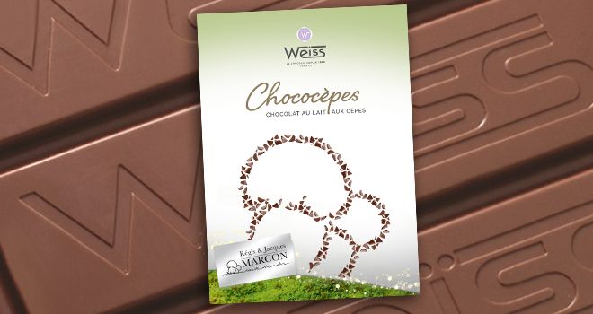 Un chocolat au lait et aux cèpes ! Une idée originale de Régis Marcon fabriquée à façon par la chocolaterie Weiss. Pour séduire artisans pâtissiers et chocolatiers, Chococèpes 42 % propose des notes de champignons et de sous-bois intenses obtenues grâce à l’assemblage de techniques traditionnelles et de véritables cèpes élevés en sous-bois mais également grâce à des origines de cacaos sélectionnées qui prolongent l’intensité du goût de cèpes. Un produit disponible en pain de 1 kg.