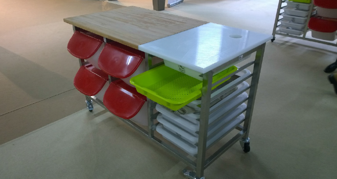 La société Roure propose un véritable laboratoire sur roulette. Idéal pour vos préparations snacking : vous aménagez votre plan de travail en fonction de vos besoins et en fonction également de vos espaces de travail (puisqu’il est facilement déplaçable). Vous avez ainsi tous vos produits à portée de main, et au moment voulu. Selon votre utilisation, vous pouvez moduler le support : inox, hêtre ou polyéthylène.