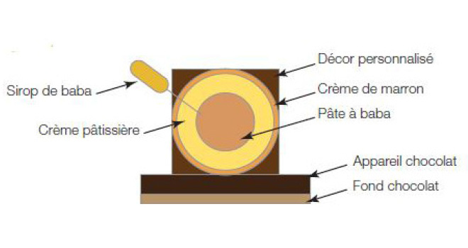 Faire une crème pâtissière classique. Après cuisson, ajouter le beurre et le rhum. Mélanger et refroidir entre 2 feuilles guitare. Émulsionner et garnir les babas aussitôt. Avec un couteau, percer le papier film et injecter la crème dans le milieu et à plusieurs endroits. Bloquer au froid. Après durcissement, enrober les babas de crème vanille rhum et les enrouler dans la pâte de marron détendue avec de la crème au rhum. Surgeler afin de pouvoir découper les babas individuels et déposer sur des fonds chocolat.