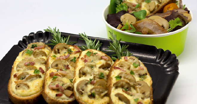 Astuce du chef. L’utilisation de champignon émincé en conserve permet une grande souplesse d’utilisation et un bon maintien de la recette tout au long de la journée (car le produit est stabilisé). Les bruchettes permettent de proposer à vos clients un produit gourmand à consommer chaud ou tiède, elles sont une belle alternative aux paninis et pizza et ne demande pas de matériel spécifique (juste un four ou un toasteur).
