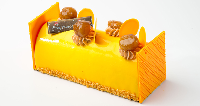 - Insert : En cadre de 10 x 49. Avec un biscuit châtaigne tartiné de compotée de mandarine, crémeux mandarine, brisures de marrons puis refermer avec un autre biscuit tartiné de compotée de mandarine. Congeler. Puis couper en deux l’insert.