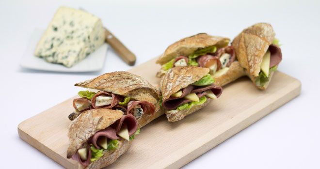 ❙ Garnir le sandwich en alternant une pointe sur deux : salade/rôti/cantal et salade/saucisson/bleu d’Auvergne.