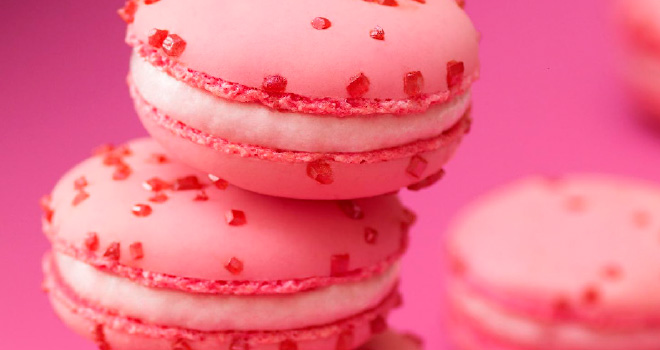 Tamiser deux fois sucre glace et poudre d’amandes ensemble. Cuire les 300 g de sucre et l’eau à 110 °C et verser sur les blancs (B) tiédis et légèrement montés avec les 30 g de sucre. Colorer et monter jusqu’à refroidissement presque complet. Mélanger les blancs (A), avec la poudre d’amandes et le sucre glace, puis ajouter la meringue italienne et macaronner. Dresser avec une douille de 10 mm sur silpat. Saupoudrer de sucre cristal mélangé avec la poudre scintillante rubis et la poudre de feuille de cerisier. Cuire à 150 °C oura ouvert pendant 8 min dans un four ventilé. Débarrasser le silpat sur grille et laisser refroidir puis décoller les coques.