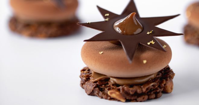 Mettre le crémeux praliné en poche munie d’une douille unie de 14 mm sans le travailler. Pocher une pointe de crémeux sur chaque disque de croustillant puis placer les palets préalablement pulvérisés. Pocher une belle pointe de crémeux sur chaque petit gâteau puis placer les étoiles ajourées en chocolat. Terminer avec quelques éclats de feuilles d’or.
