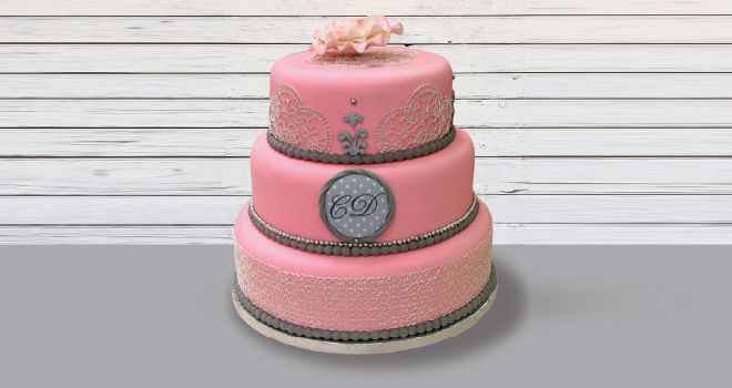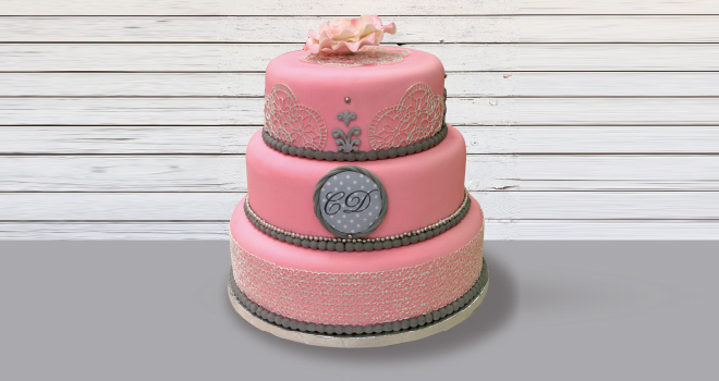 Vous pouvez maintenant commencer à recouvrir les gâteaux. Pour assurer la stabilité de votre pièce montée, il faut placer chacun de vos gâteaux sur un cake drum du même diamètre et recouvrir la base du cake drum comme partie intégrante du gâteau. Commencez par bien malaxer la pâte à sucre rose pastel qui va permettre de recouvrir le gâteau. Utilisez ensuite un rouleau 50cm pour l’étaler sur environ 3/4mm (astuce : le diamètre de la pâte à sucre étalée doit dépasser de 10cm environ tout autour du gâteau, cela facilitera le lissage). Une fois qu’elle est suffisamment étalée, enroulez-la autour du rouleau comme vous le feriez avec une pâte brisée par exemple. Cela lui évitera de se déchirer. Positionnez-la sur le gâteau de façon équilibrée. A l’aide du lisseur, lissez le dessus du gâteau ainsi que son contour. Une fois cette étape terminée, retirez avec un scalpel le surplus de pâte à sucre qui dépasse. Recommencez pour les 2 autres parties de la pièce montée. Ensuite avant d’assembler les 3 étages du gâteau, il vous faudra utiliser des renforts qui vous permettront de solidifier le tout. Coupez-les aux bonnes dimensions et placez 4 morceaux en carré au niveau du centre du gâteau. Réitérez l’étape pour le deuxième étage. Vous pouvez couler un peu de glace royale entre chaque étage pour que la pièce montée soit bien stable. Passez à la décoration en réalisant par exemple de jolies dentelles comestibles à l’aide des préparations Dentelles or et argent. Agrémentez de rubans de pâte à sucre grise et de perles argentées, collés avec la colle alimentaire.