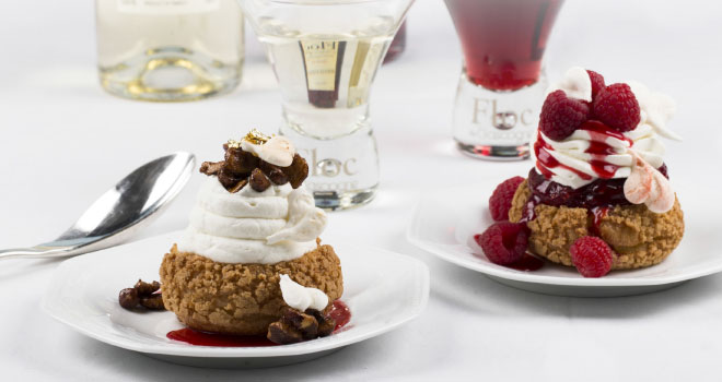 ❙ Pour Elle : Couper 10 choux aux deux tiers de la hauteur. Déposer dans le fond une boule de compote de framboise au floc. Sur le dessus, réaliser une rosace de crème fouettée. Décorer de framboises fraîches et de petits cœurs en meringue et napper de coulis framboise au floc rouge.